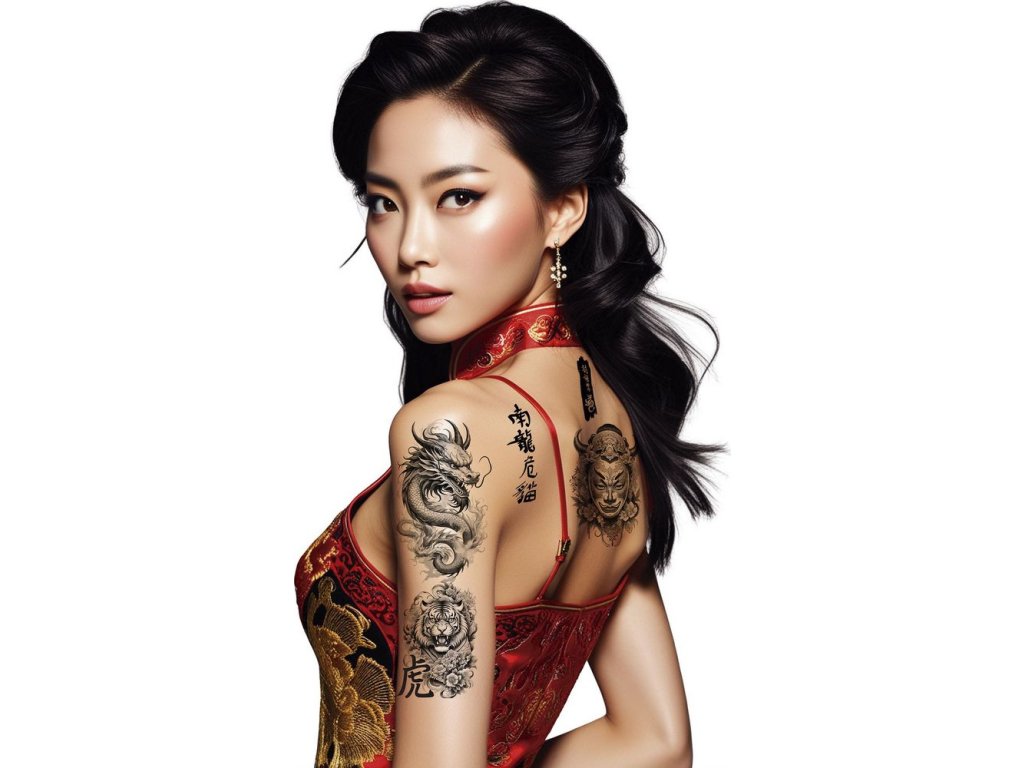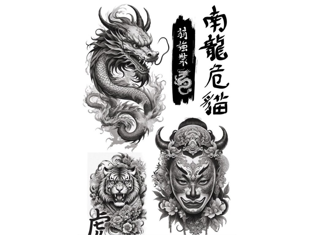 Asijské tetování obsahuje draka, tygra a jiné čínské kresby. Krásný doplněk pro váš kostým ve stylu Číny, motorkáře, piráta, ninja, drsňáka nebo rockera.