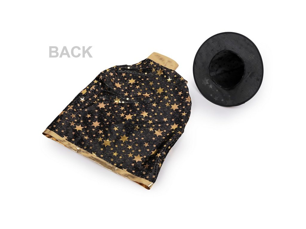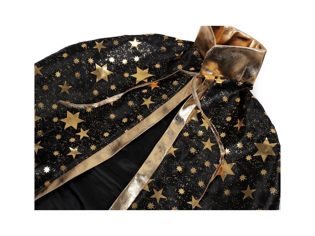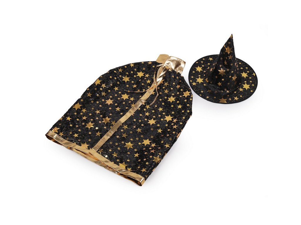 Dětský čarodějnický karnevalový kostým se skládá z klobouku a pláště. Jeho nositel získá úchvatný vzhled čaroděje, kouzelnice, mága nebo černokněžníka. Klobouk dobře drží tvar. Plášť je pevný, s límcem a zavazováním kolem krku. Kostým je ozdobený metalickým potiskem hvězd.