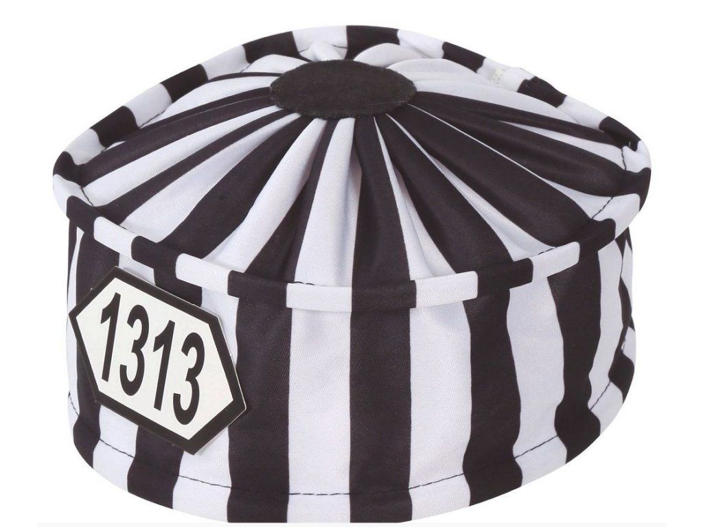 Karnevalový doplněk látková čepice pro vězně.Vhodné na karnevalové akce a jiné zábavy.