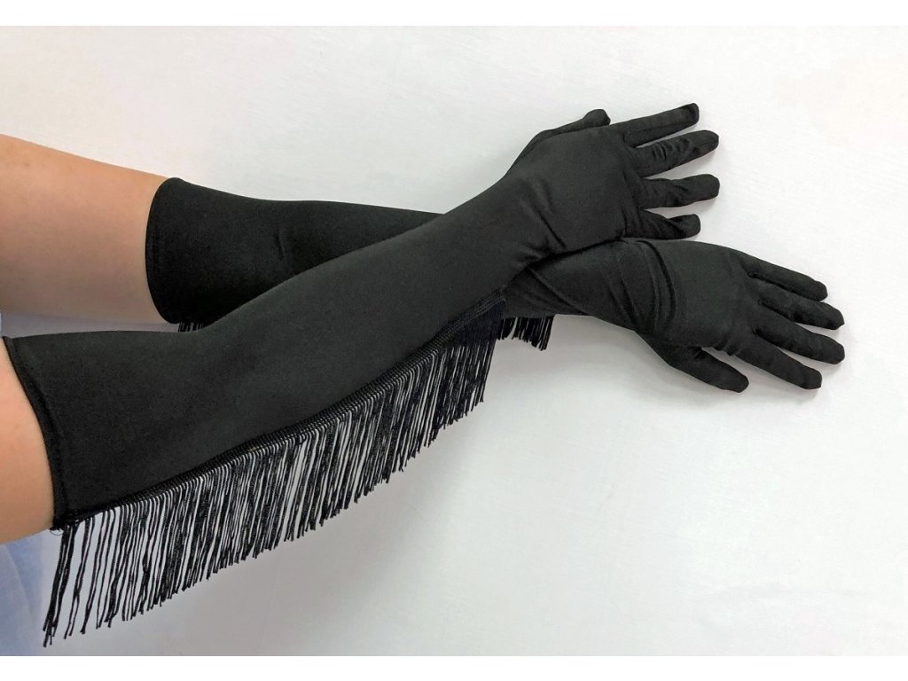 Černé saténové rukavice s třásněmi - 55cm