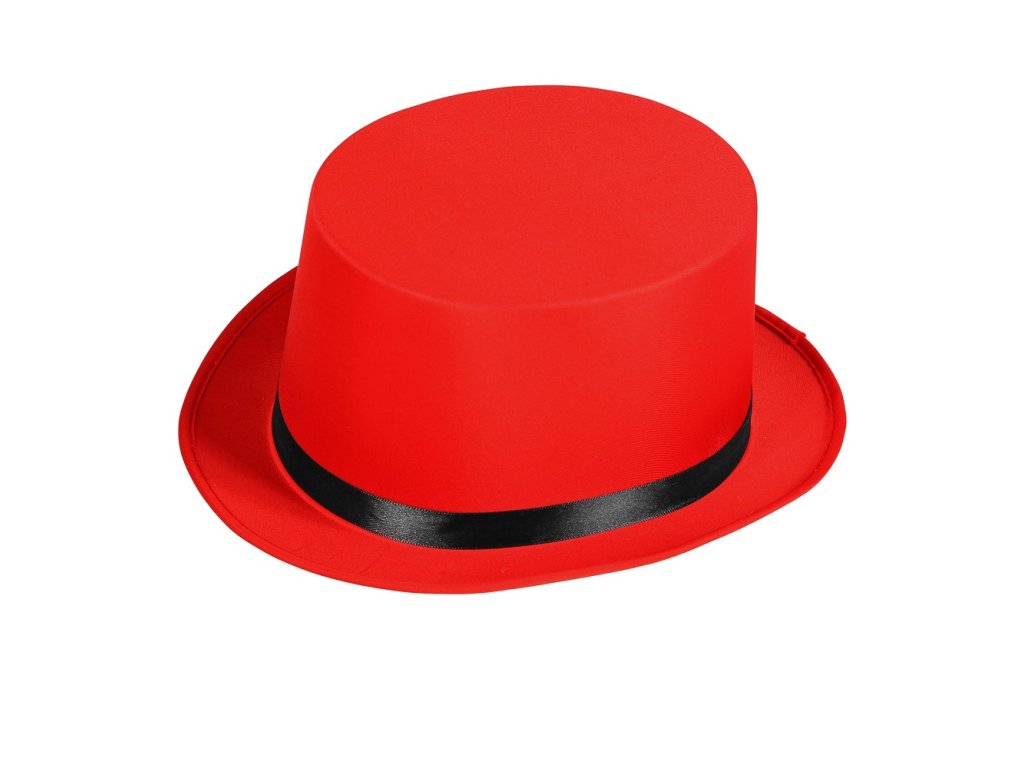 Červený cylindr. Vhodný jako karnevalový doplněk ke kostýmu klauna, Tři veteráni a jiné.