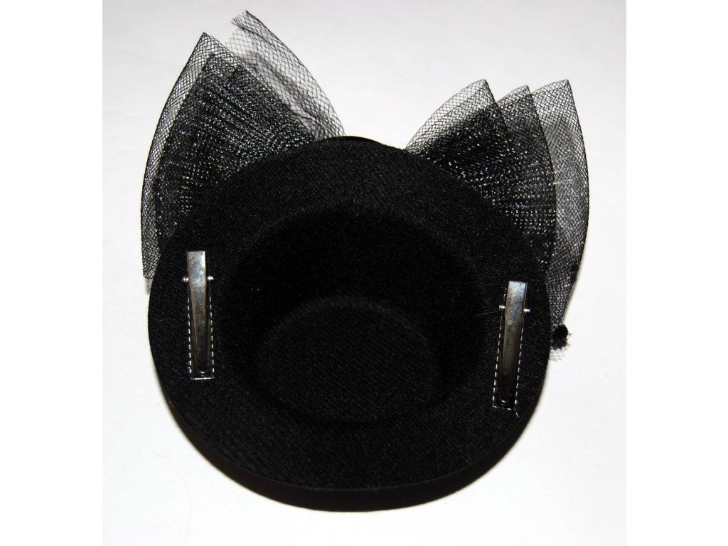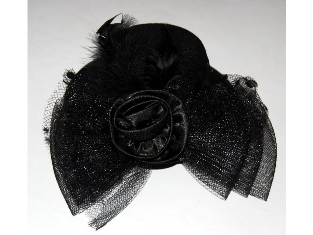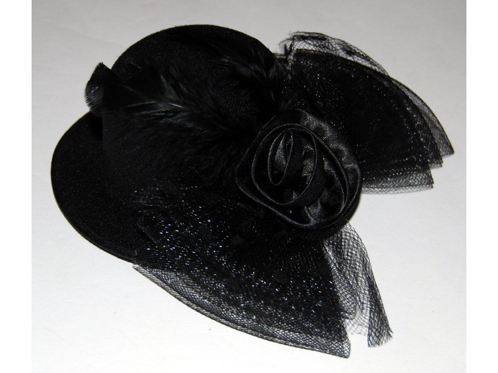 Černý malý plstěný klobouček s tylovou mašlí červenou růží a s černým pírkem vysoký cca 8cm. Klobouk má průměr 13 cm. Pro připevnění tohoto klouboučku použijete dvě mále spony, které jsou součástí , tak Vám bude dobře držet. Vhodné na 30. léta, ale i na jiné akce.
