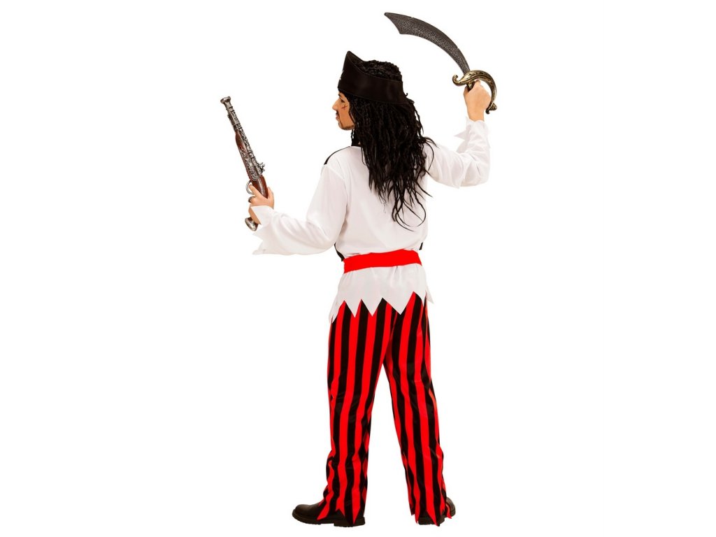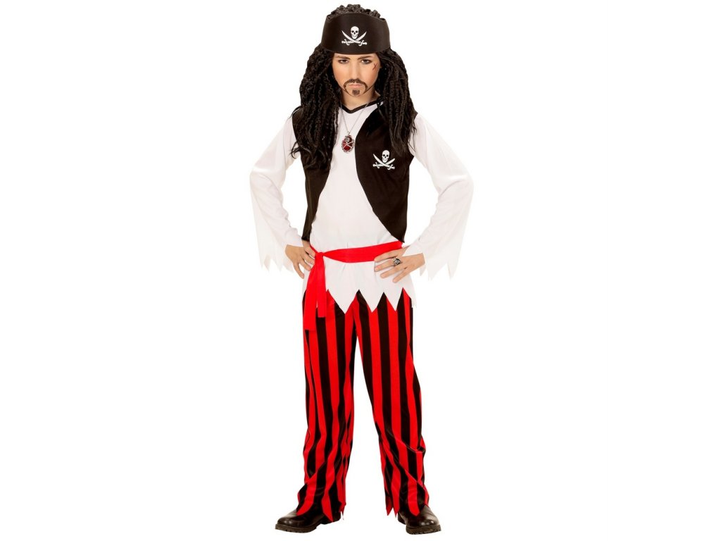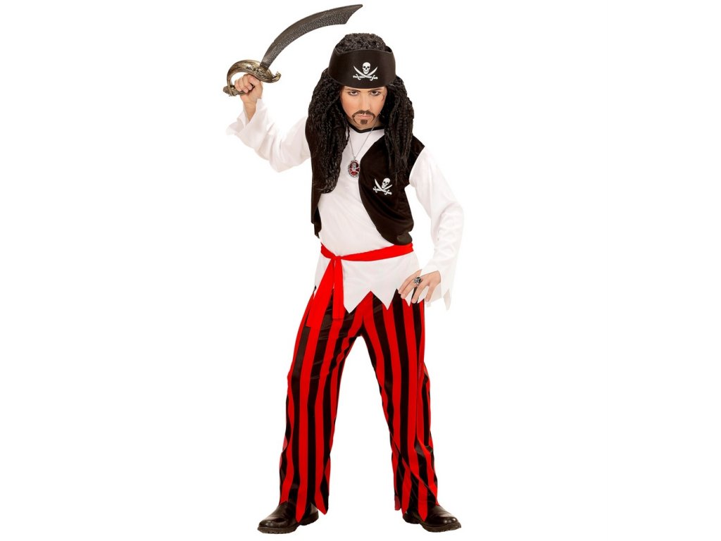 - Dětský kostým piráta obsahuje tričko s vestou, červený opasek, proužkované černo-červené kalhoty na koncích roztřepené a černý šátek s lebkou a zkřížené meče.