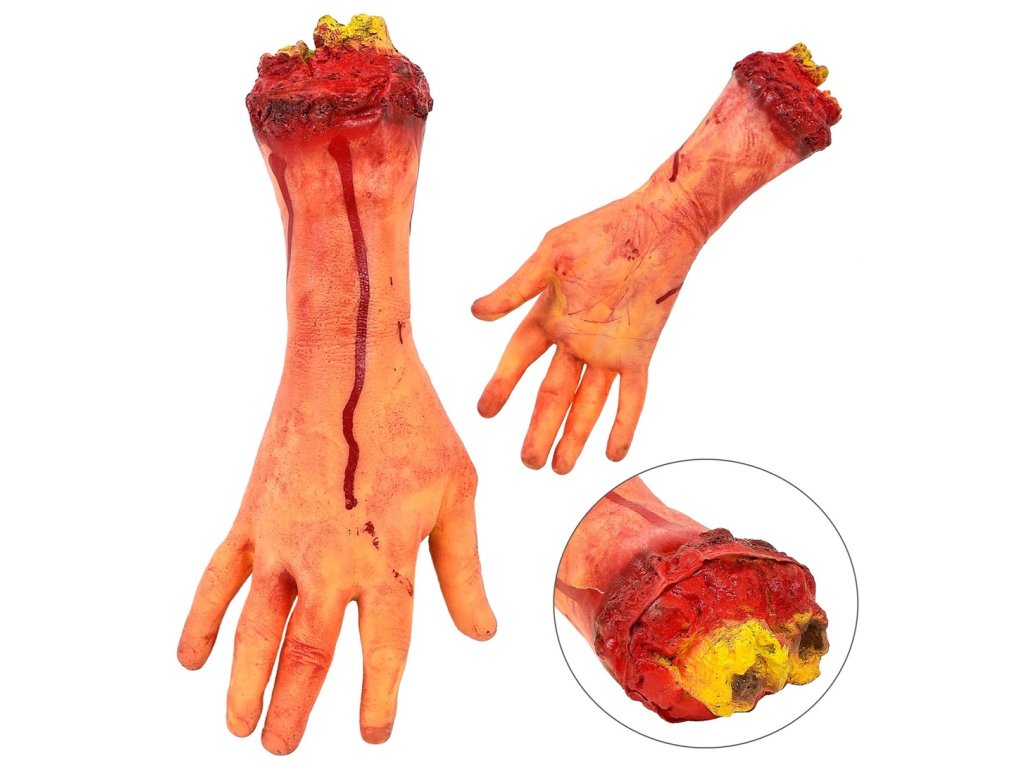 Utrhnutá krvavá ruka je vyrobena z latexu, vhodná jako dekorace na halloween, karneval nebo jako morbidní žertík. Délka ruky je cca 30cm.