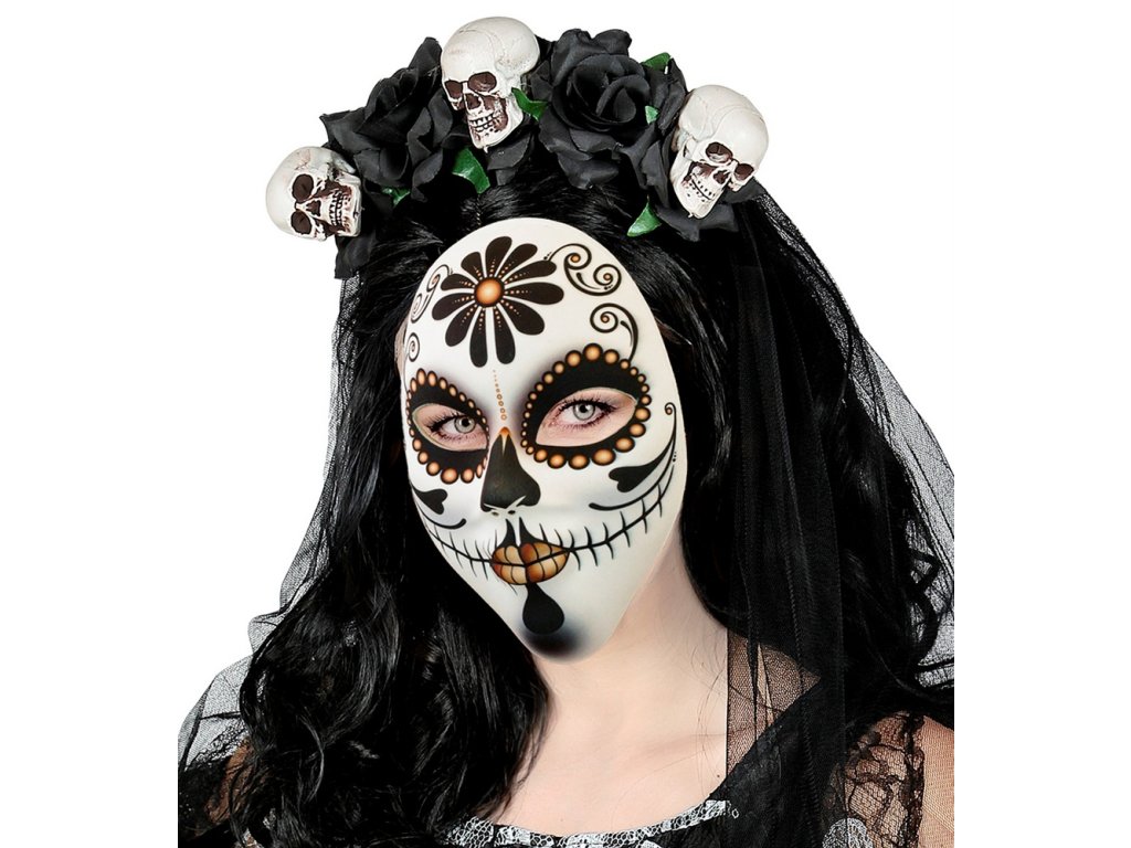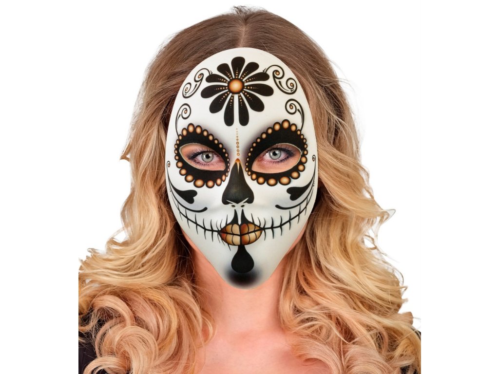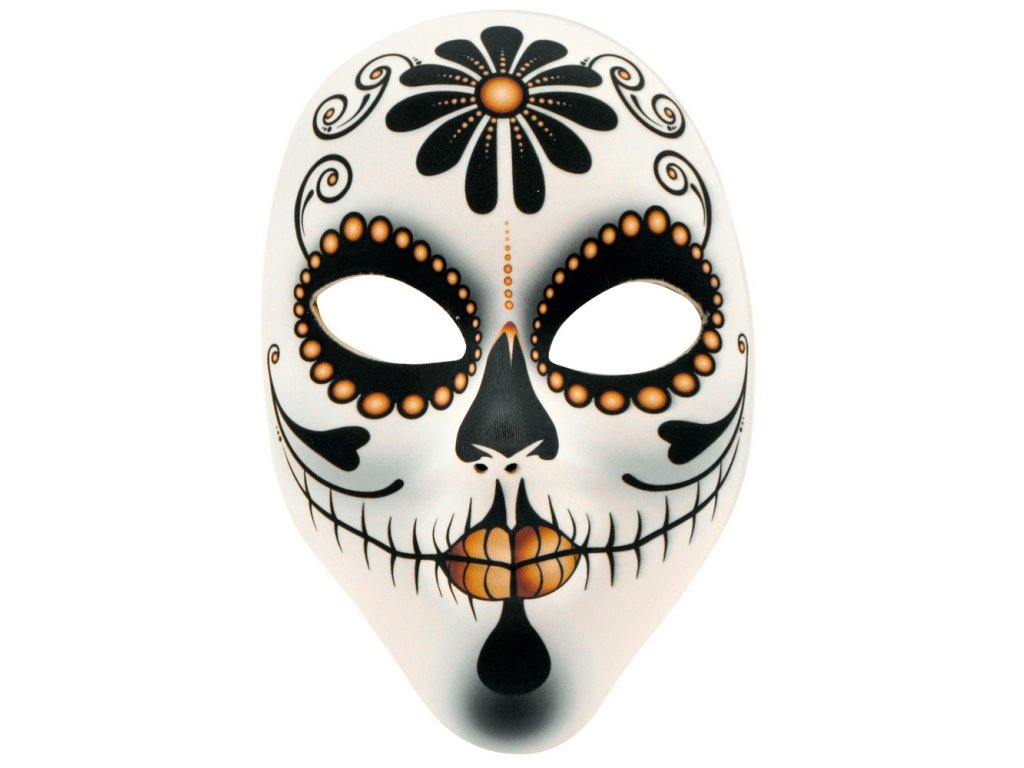 Senzační maska na obličej s motivem muerte - Dny mrtvých. Maska drží na gumičku, která je k masce připevněna. Staň se hvězdou večírku díky této senzační masce a ohrom všechny své kamarády!