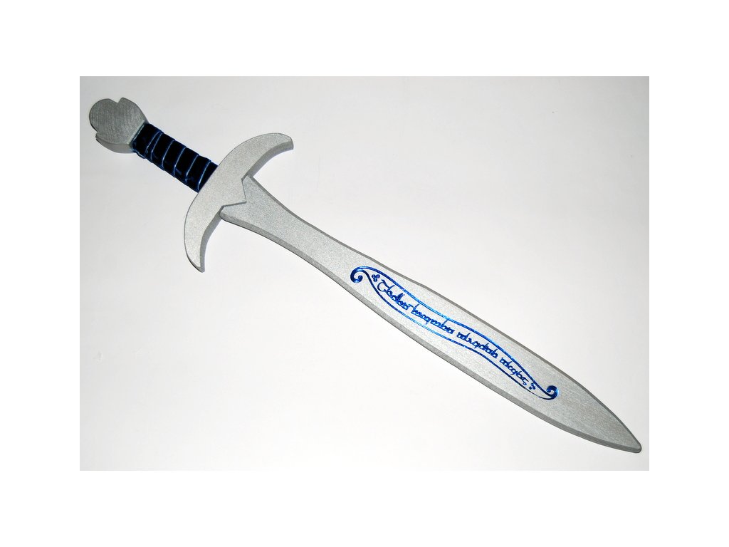 Dřevěný meč se stříbrnou čepelí s měděným potiskem na motivy filmu Pán prstenů a Hobit. Stříbrná záštita, modrá omotávka a stříbrná hlavice. Délka 55cm.