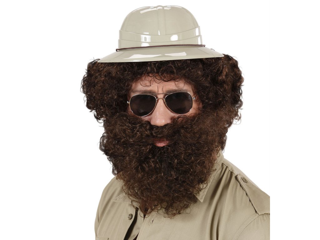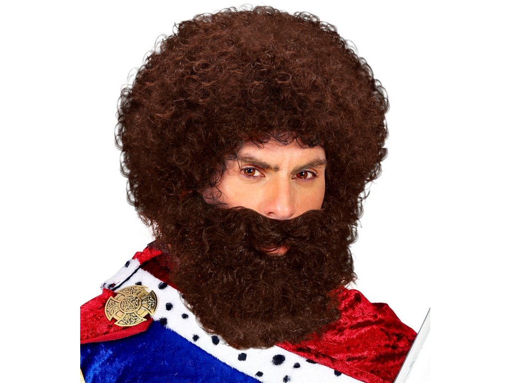 Karnevalová hnědá paruka společně s vousy. Vhodná pro loupežníka, čerta, pračlověka a jiné karnevalové postavy.