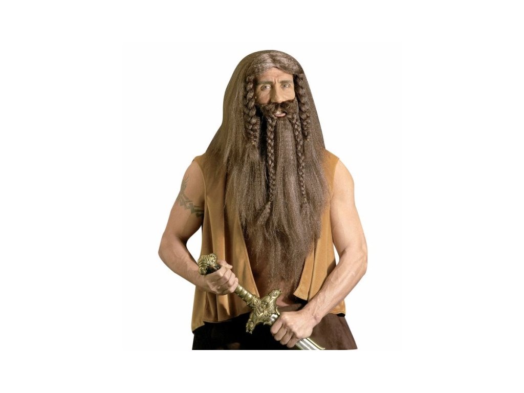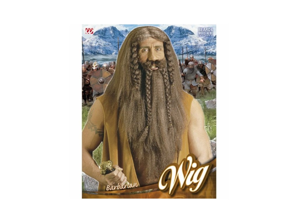 Karnevalová paruka dlouhá, hnědá společně s dlouhými vousy s copánky, pro barbara, pračlověka,.....
