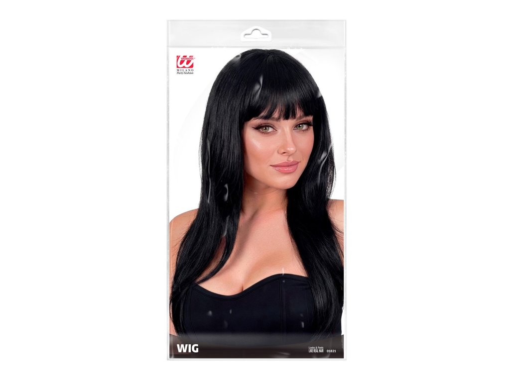 Karnevalová, dlouhá, černá paruka s ofinou. Použít můžete na halloween, párty, nebo jen pro změnu image.