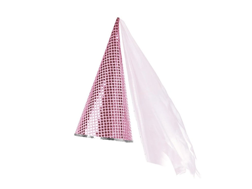 Růžová špičatá čepička se závojem vhodná pro princezny, hradní paní a jiné pohádkové bytosti.