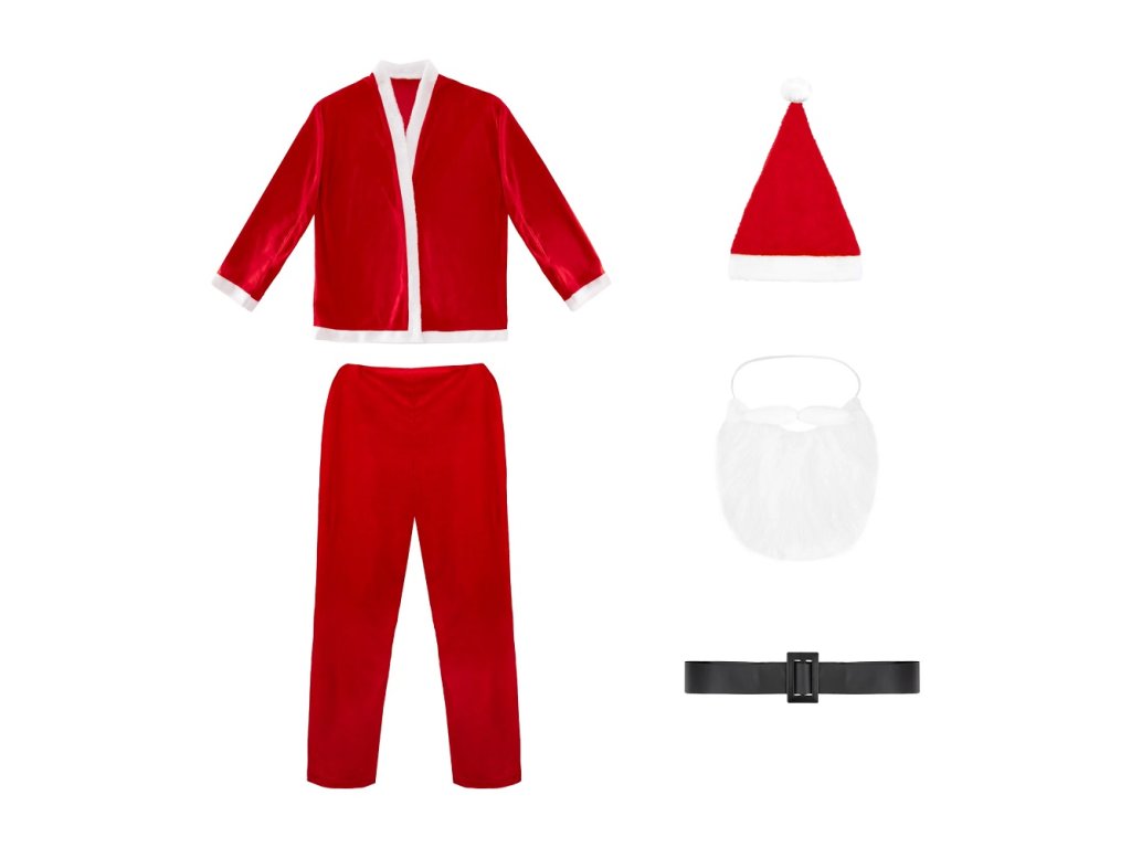 Sada pro Santu obsahuje kabát, kalhoty, opasek, vousy a čepici.