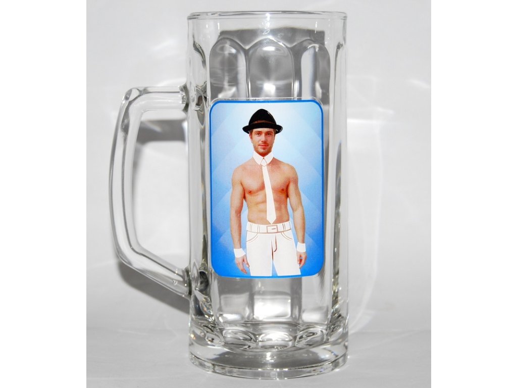Po nalití studeného nápoje se půllitr orosí a muž se svlékne.