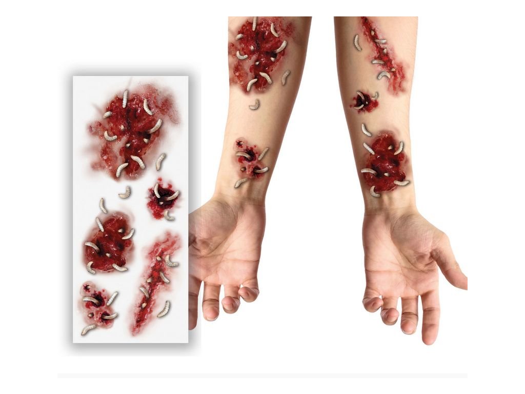 Tetování - Rány s červy . Krásný doplněk pro váš Halloweenský kostým upíra, zombie nebo jiného nemrtvého.